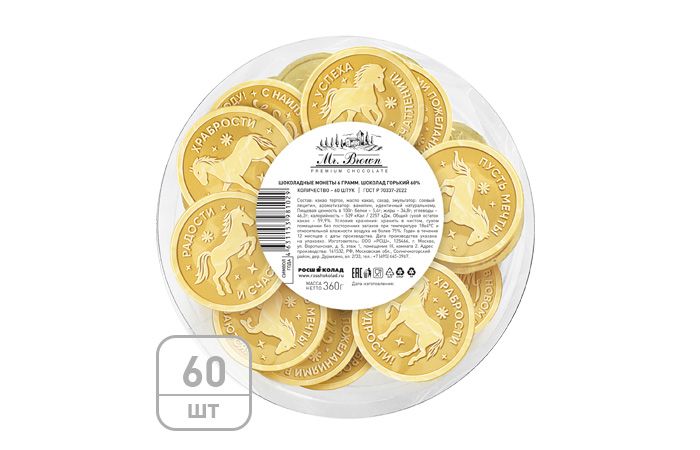 На сайте представлена вся необходимая о товаре информация – цены, наличие на складе и описание. Продажа шоколадной монеты «2026 год – год лошади» 6г в тубе по 60шт [молочный, золото] осуществляется с доставкой или на условиях самовывоза с ближайшего к вам склада.