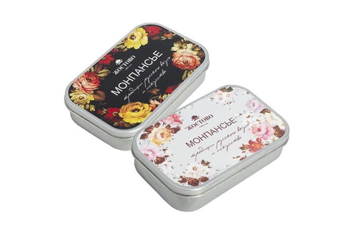 Базовое изделие – прямоугольная жестяная банка 98х63х20 мм, полноцветная CMYK печать на крышке банки, термоусадочная пленка. Изображение наносится на скоростном японском оборудовании специальными УФ-чернилами. Цвет баночки – серебро или золото. Сроки изготовления заказа – от 7 до 14 дней с момента утверждения макета и перечисления оплаты.